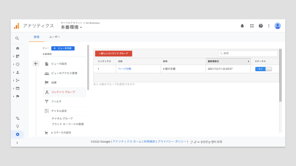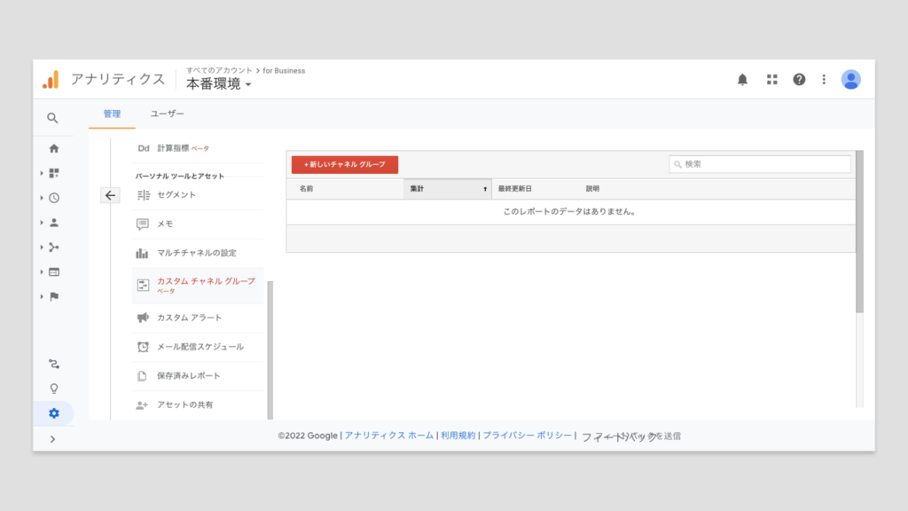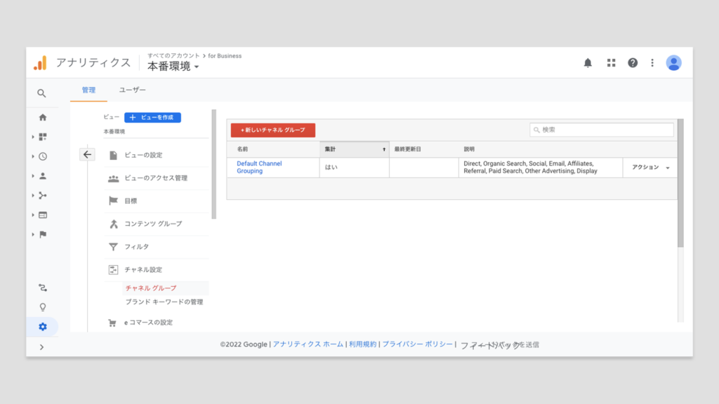 | チャネル設定 | 流入元を特定できるチャネルレポートのためにチャネルのグルーピング作業を設定します。何も設定を行わなくてもデフォルトで定められているチャネルがあるためそちらでも十分に活用できますが、独自にグルーピングを行いたい場合はチャネルグループを新たに作成することも可能です。 またチャネルの中に自社サイトなど含めたくないチャネルがある場合は除外設定も行います。 |