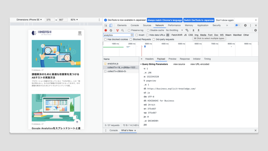 「Network」タブの検索窓に「analytics」と入力すると「collect?v=…」というファイルが出てきます。「collect?v=…」をクリックすると右側にデータが表示されるようになります。