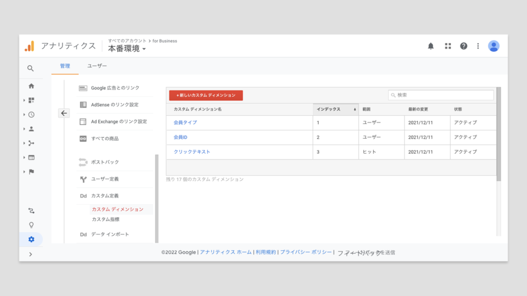 ページビューやイベントで取得できる項目はページURLやタイトルなどのページ情報とイベント設定によって取得できるイベントカテゴリ、イベントアクション、イベントラベルのみになります。ページビュー計測の際にページ以外の情報やイベント計測の際にデフォルトの3枠以外のデータを取得したい際にカスタムディメンションを使います。