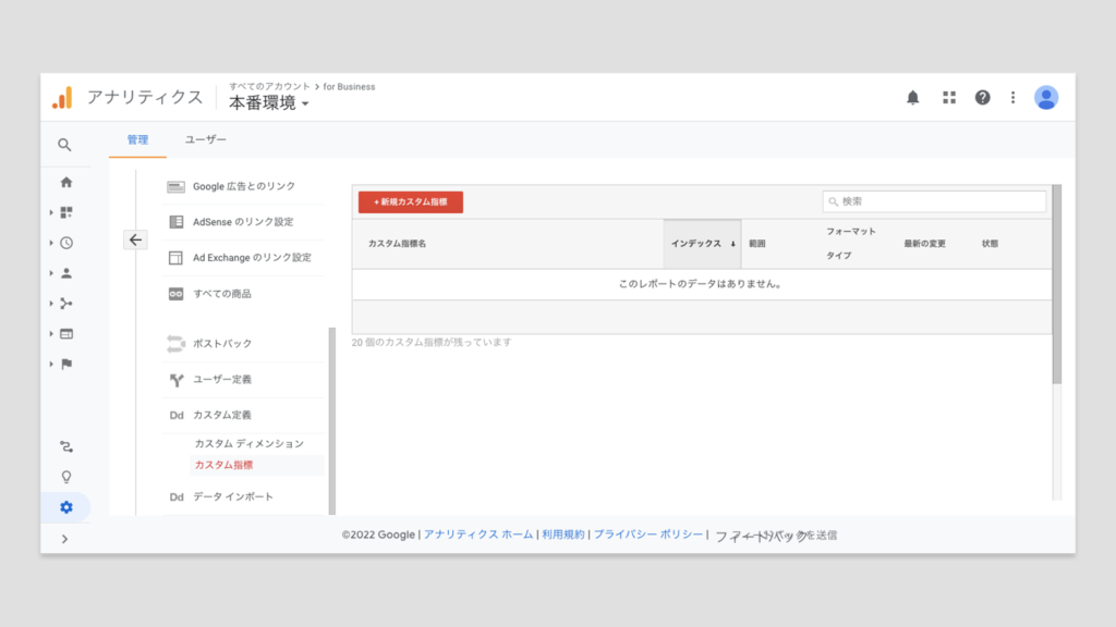 ページビューやイベントで取得できる指標はページビュー数やユーザー数というページの訪問状況とイベント数というイベントが発生した数のみになります。ページビュー計測の際にページビュー数、ユーザー数以外やイベント数以外のデータを取得したい際にカスタム指標を使います。