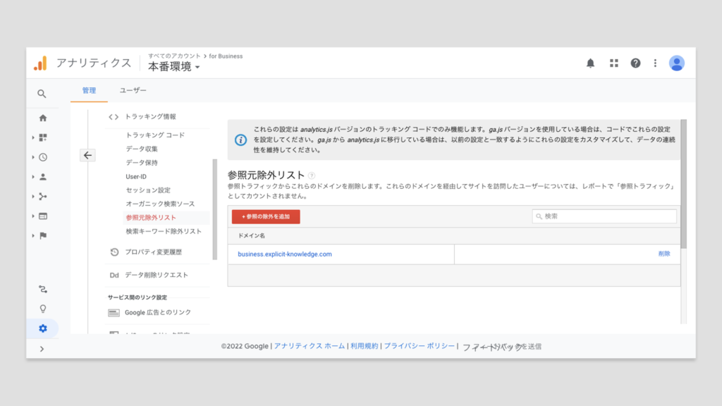 Google Analyticsに収集したデータの保持期間を設定します。設定項目はプロパティの中にある「トラッキング情報のデータ保持 」の項目で対応します。