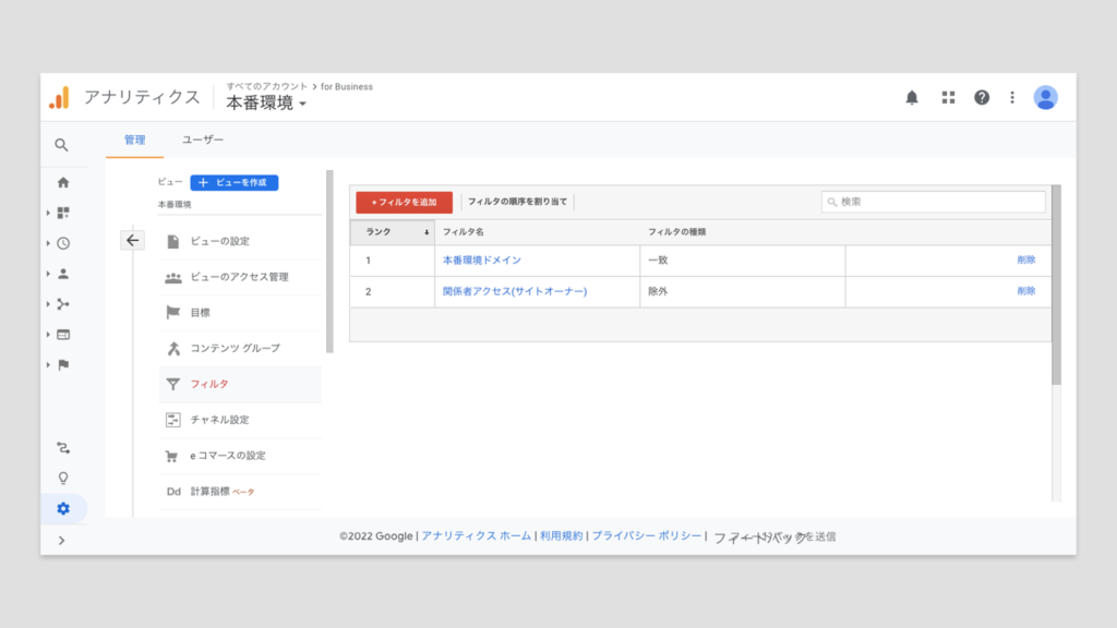 | フィルタ名 | 任意に設定 ex)サイト名本番環境 |