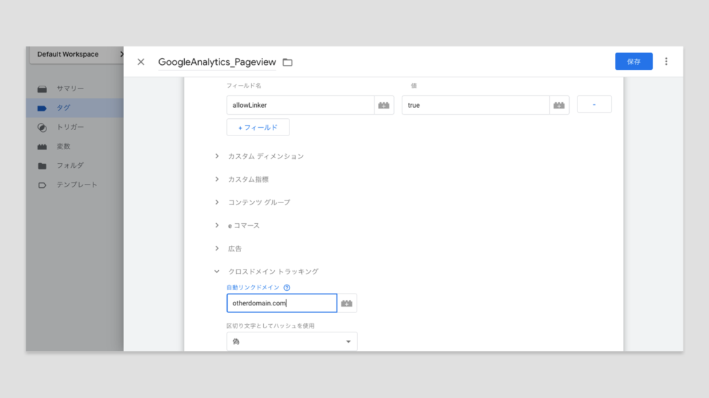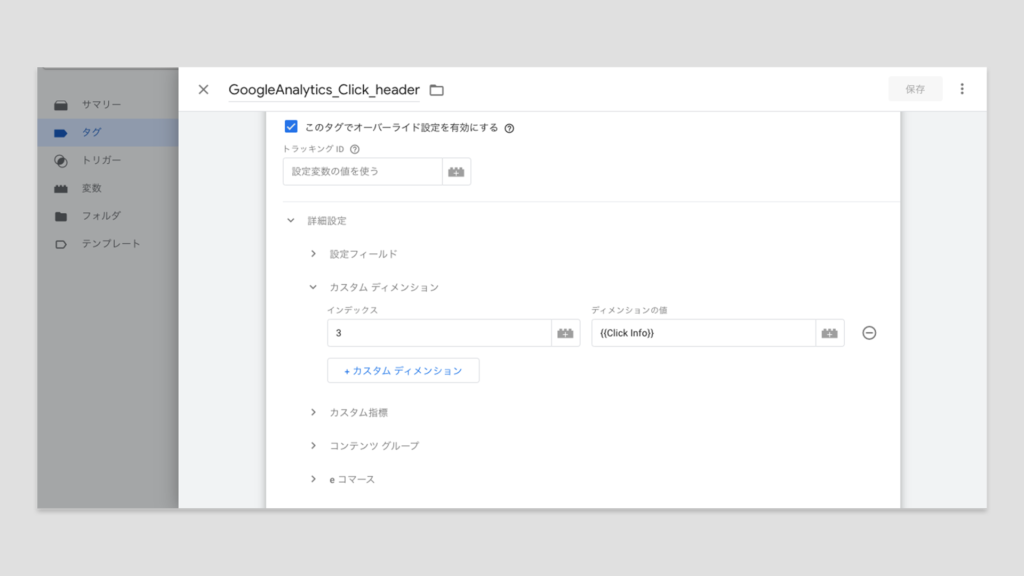 カスタムディメンションを設定する際は、Google Analyticsタグの詳細設定を開き「カスタムディメンション」に必要な項目を設定していきます。