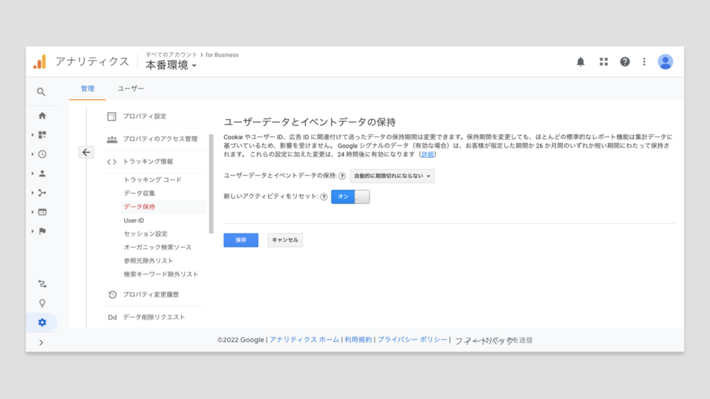 | ユーザーデータとイベントデータの保持 | 「自動的に期限切れにならない」を選択 ※データの保持期間を限定しないといけない場合は14ヶ月,26ヶ月,38ヶ月,50ヶ月の中から選択 |
