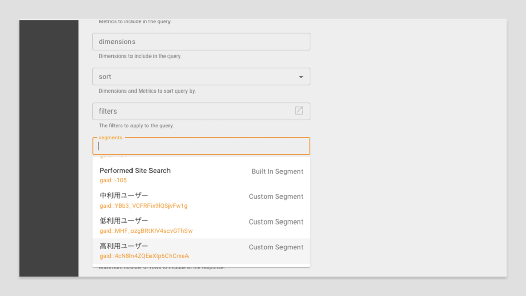 Query ExploreにGoogle Analyticsの権限が紐づいているGoogleアカウントでログインすると「Segment」の入力欄にセグメントとAPI keyがセットで確認できます。使用したいカスタムセグメントの「ga:」で始まるコードを「Segment」の入力欄に記載します。