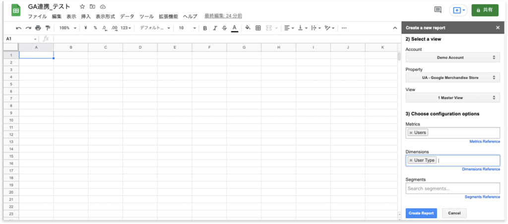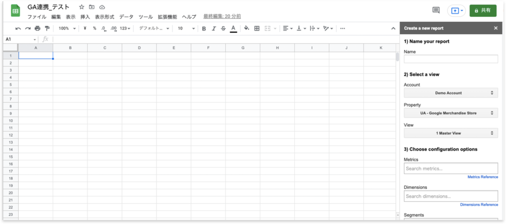 必要な環境が準備できたら、Googleスプレッドシートのアドオンを使ってGoogle Analyticsから取得したいデータを抽出していきます。