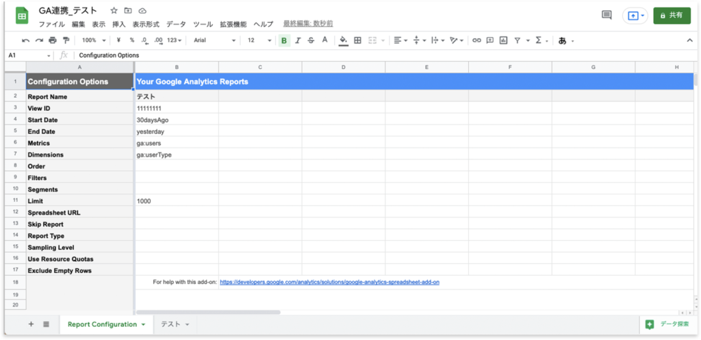 | Spreadsheet URL | デフォルトは現在設定しているスプレッドシートにタブが生成されてレポートが出力されるが、別のスプレッドシートへ生成したい場合は、そのURLを指定する。ただし指定したスプレッドシートの編集権限が必要。 |